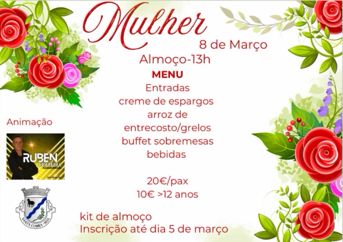 Vem celebrar o Dia da Mulher! Almoço - 13h | Animação de Ruben Ferreira Kit de almoço - Inscrições até dia 5 de Março MENU Entradas creme de espargos arroz de entrecosto/grelos buffet sobremesas bebidas 20€/pax | 10€ >12 anos