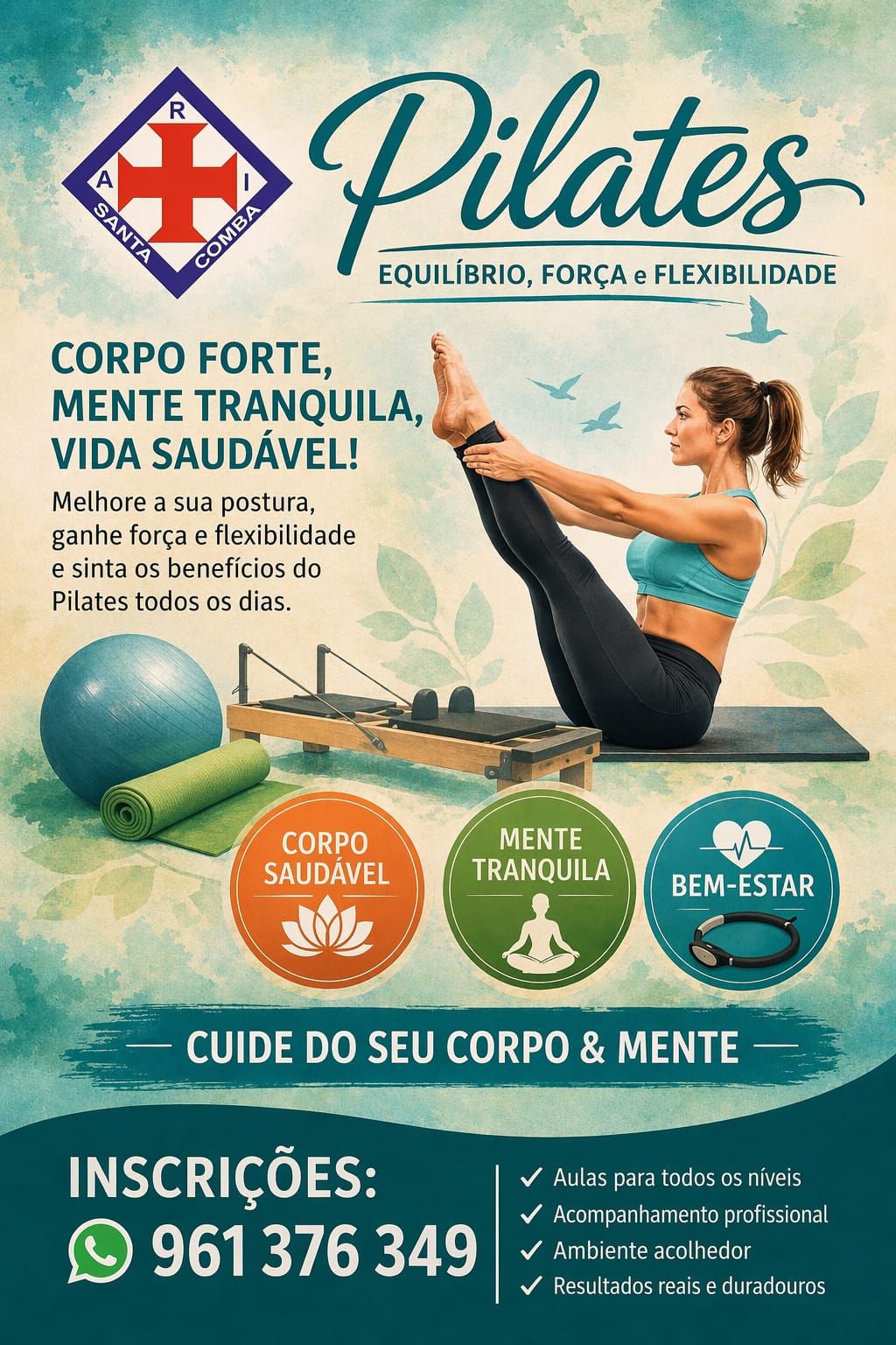 Melhore a sua postura, ganhe força e flexibilidade e sinta os benefícios do Pilates todos os dias. CUIDE DO SEU CORPO E MENTE INSCRIÇÕES: 961 376 349 - Aulas para todos os níveis - Acompanhamento profissional - Ambiente acolhedor - Resultados reais e duradouros